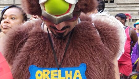 Folião presta homenagem emocionante a cão Orelha durante desfile do Cordão da Bola Preta, chamando a atenção para maus-tratos e pedindo justiça.
