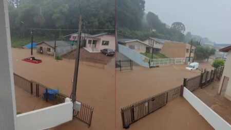 Chuva forte alaga ruas em Palmas, Paraná – Simepar registra 99,4 mm de precipitação na cidade, deixando carros submersos.