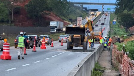 Chuva causa erosão na Via Dutra em São José dos Campos: Faixas interditadas e congestionamento de 5km no km 146. Equipes atuam na solução do problema.