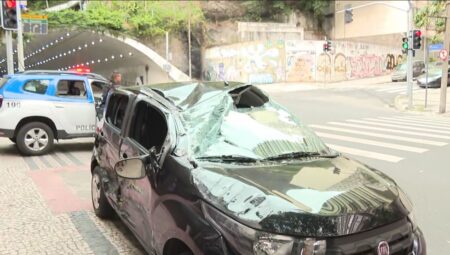 Carro fica ilhado em rua alagada durante chuvas em Piracicaba.