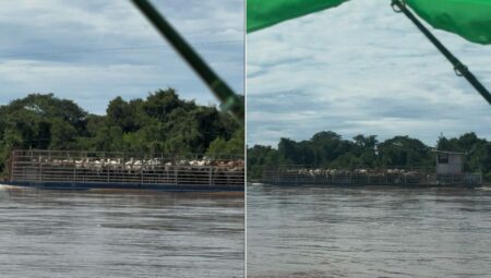 Pescadores impressionados: balsa cheia de gado no Rio Araguaia