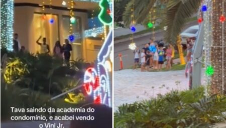 Crianças tietam Vini Jr. na mansão de Virgínia em Goiânia: festa antecipada de Natal com craque do Real Madrid