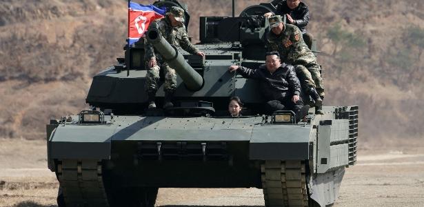 Imagens mostram adolescente controlando tanque acompanhada por Kim Jong-un, indicando sinais de sucessão. Modernização de arsenal e demonstrações públicas sinalizam capacidade militar.