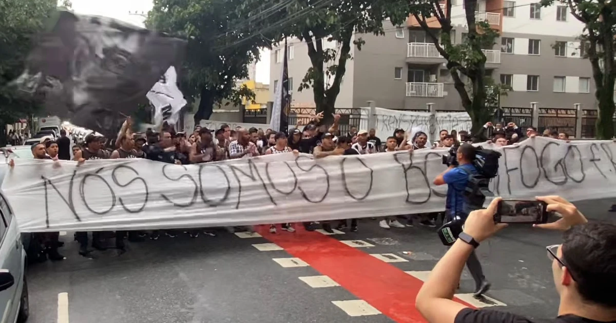 Torcedores do Botafogo se manifestam contra John Textor em protesto realizado nos arredores do Estádio Nilton Santos antes de jogo pelo Campeonato Carioca.