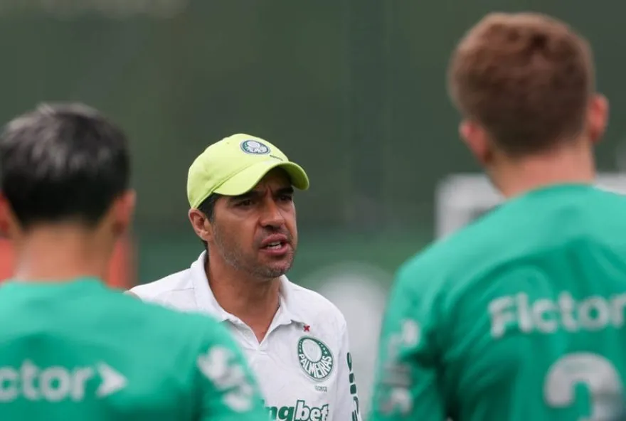 Abel Ferreira conversa com o time do Palmeiras antes do confronto direto com o Flamengo. Outras notícias do Palmeiras incluem o motivo da ausência de Leila Pereira no Maracanã neste domingo e a estreia do goleiro mais caro da história do Palmeiras, Carlos Miguel, em uma sequência decisiva.