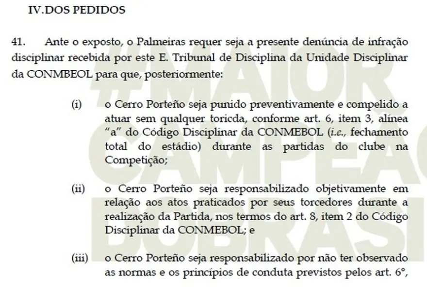 Os pedidos requeridos pelo Palmeiras à Conmebol foram os seguintes: 1. Que o Cerro Porteño seja punido preventivamente para atuar sem torcida durante a competição. 2. Que o Cerro Porteño seja responsabilizado pelos atos praticados por seus torcedores. 3. Que o Cerro Porteño seja responsabilizado por não ter observado as normas e princípios de conduta do Código Disciplinar da Conmebol e do Código de Ética. 4. Para além das sanções anteriores, requer a aplicação de multa ao Cerro Porteño no patamar de 400 mil dólares devido à reincidência. 5. Que o Cerro Porteño seja desclassificado da competição conforme possibilidade de aplicação de penalidade diferente da multa do Artigo 15 do Código Disciplinar.