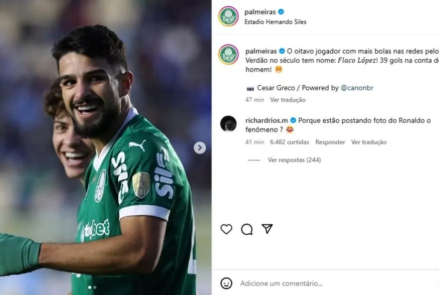 A vitória do Palmeiras por 3 a 2 sobre o Bolívar, na Conmebol Libertadores, rendeu brincadeiras nas redes sociais. Richard Ríos, que não viajou para La Paz por dores no tornozelo, comentou em uma publicação do clube com foto do centroavante. Ele questionou por que estavam postando foto do Ronaldo Fenômeno, fazendo uma alusão bem-humorada ao jogador que marcou época no futebol mundial. Essa interação descontraída entre os atletas demonstra o bom ambiente e espírito de equipe no Palmeiras.