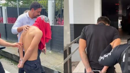 Então, o motorista sai do carro e corre atrás da mulher, a batendo com um facão na altura das pernas. Após a agressão, o homem corre de volta para o carro e sai com veículo.