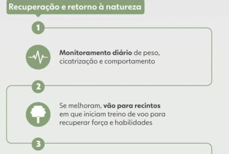 Na fase final, as aves ficam nos viveiros até retomarem a capacidade de viver sozinhas. O Ibama possui áreas de soltura e monitoramento.