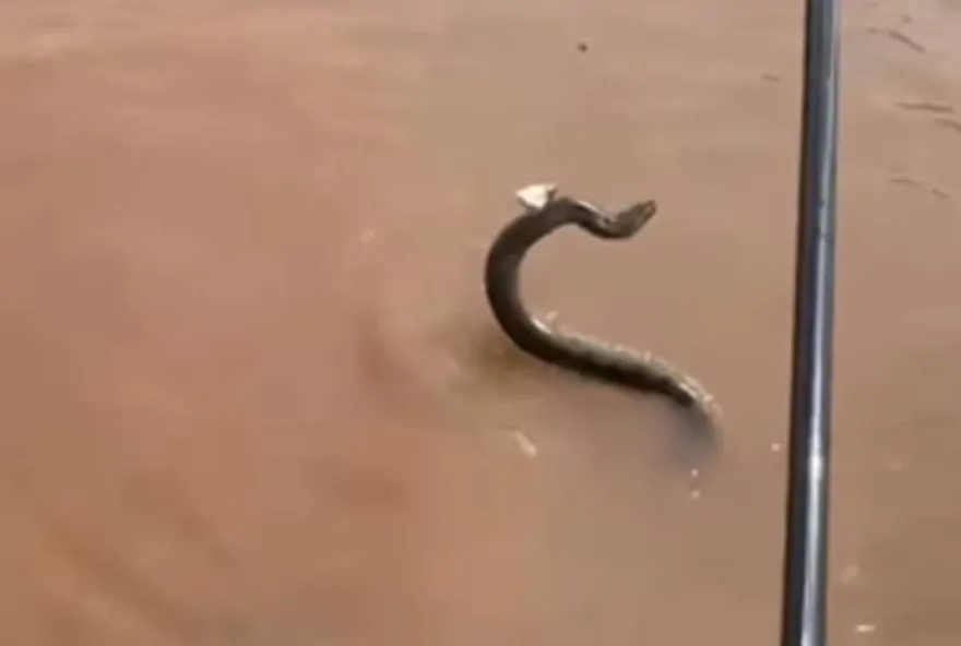 por engano uma cobra durante pescaria no Rio Araguaia, em Goiás. O momento em que a cobra está enganchada no anzol foi filmado pelo