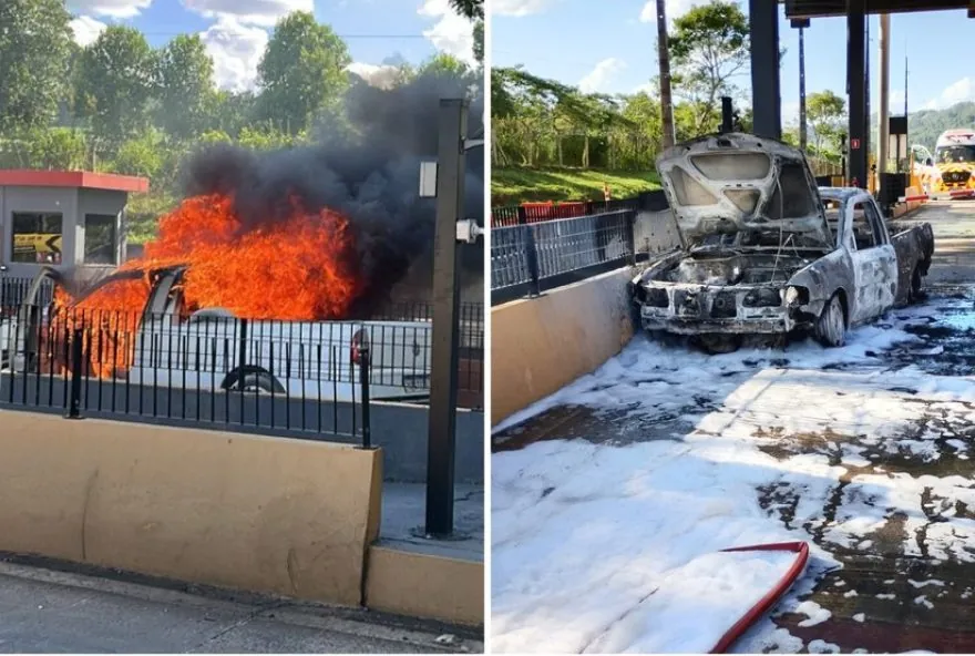 A situação aconteceu na tarde desta quarta-feira (21). “O veículo emitiu fumaça pelo motor no momento em que estava na cabine do pedágio. Os ocupantes do veículo saíram imediatamente para verificar o motor, e logo iniciaram as chamas. De acordo com o condutor, houve vazamento de combustível e o fogo iniciou”, aponta o Corpo de Bombeiros. Para combater as chamas, a corporação utilizou espuma – o chamado Líquido Gerado de Espuma (LGE). Isso porque, como havia muito metal quente, o contato dele com água causava mais explosões, segundo os bombeiros.