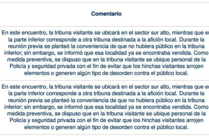 Durante a reunião prévia se questionou a conveniência de que não houvesse público na tribuna inferior, mas foi informado que esse setor já estava vendido. Como medida preventiva, foi decidido que no setor visitante sejam colocados policiais e seguranças privados com o fim de evitar que os torcedores visitantes atirem objetos ou gerem algum tipo de desordem contra o público local. Mas a orientação foi ignorada, como se viu na quarta-feira, durante a partida.