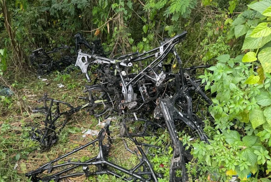 A Polícia Civil localizou e apreendeu 43 quadros de motos roubadas em área de mata