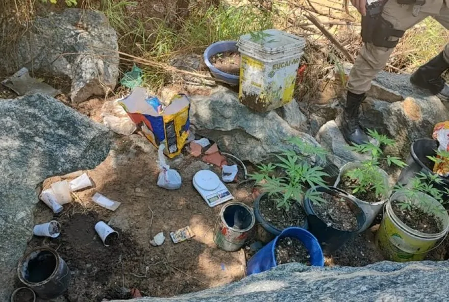 Durante a abordagem, a corporação descobriu que o suspeito mantinha fotos de uma plantação de maconha no celular e estava com uma folha com anotações que estariam relacionadas ao tráfico. Questionado pela PM, ele informou que cultivava os pés da droga às margens do rio São Domingos e utilizava o terreno para guardar os entorpecentes prontos para serem vendidos. Ao realizar buscas no local indicado, a corporação localizou a plantação de maconha e mais drogas escondidas entre pedras.