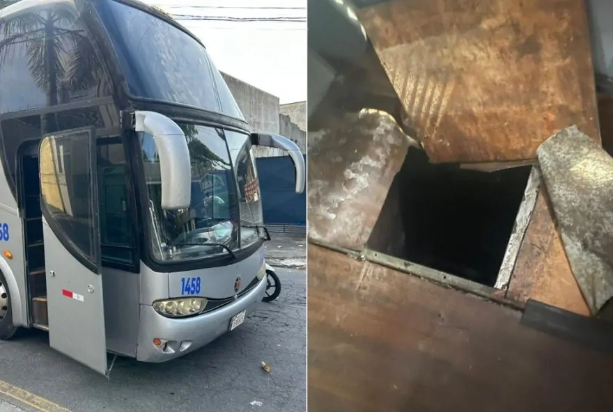 Um ônibus que transportava mais de 20 paraguaios foi apreendido pela Polícia Civil sob suspeita de transportar drogas em Guarujá, no litoral de São Paulo. Nas imagens obtidas pelo DE nesta quinta-feira (9), é possível observar um ‘fundo falso’ no veículo onde os entorpecentes poderiam estar escondidos. Até o momento, nenhuma prisão foi efetuada e nenhum entorpecente foi encontrado.