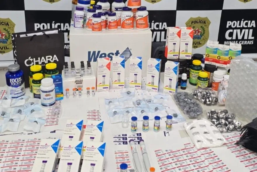 A Polícia Civil fechou um laboratório clandestino de medicamentos para emagrecer, nesta terça-feira (15), na Região Leste de Belo Horizonte. Segundo a instituição, os remédios tinham como princípio ativo a substância tirzepatida, utilizada no Mounjaro. Três homens, de 25, 34 e 58 anos, foram autuados em flagrante pelo crime previsto no artigo 273 do Código Penal, que descreve como conduta ilícita falsificar, corromper ou adulterar produtos destinados a fins terapêuticos ou medicinais. Durante a operação, os policiais do Departamento Estadual de Combate ao Narcotráfico (Denarc) encontraram frascos, rótulos, caixas térmicas, seringas e ampolas prontas para comercialização.