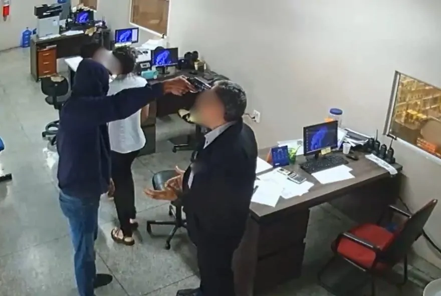 criminoso chega a apontar a arma para a cabeça de uma das vítimas.