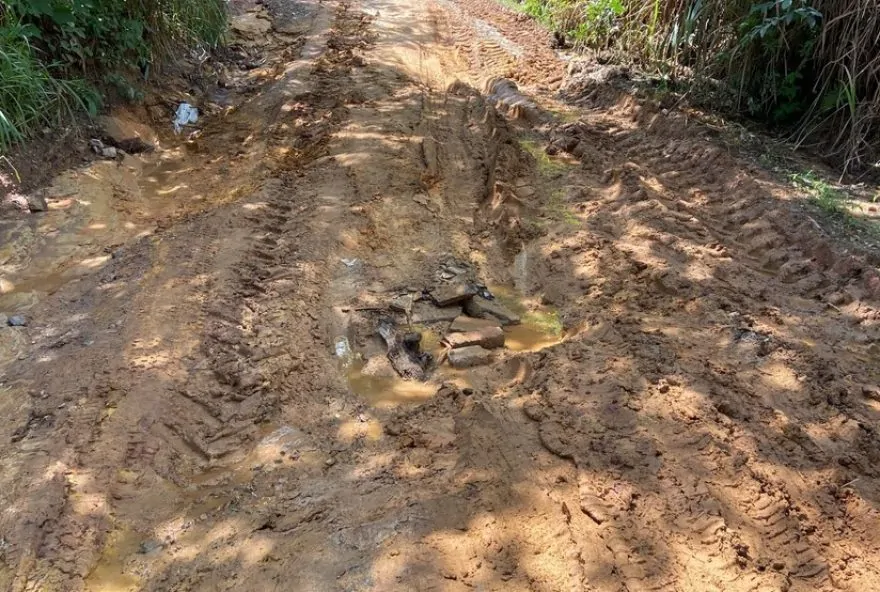 Sem asfalto e totalmente de terra, a estrada fica cheia de lama após os dias de chuva. Em alguns pedaços, a água abre valetas no meio da via, impossibilitando