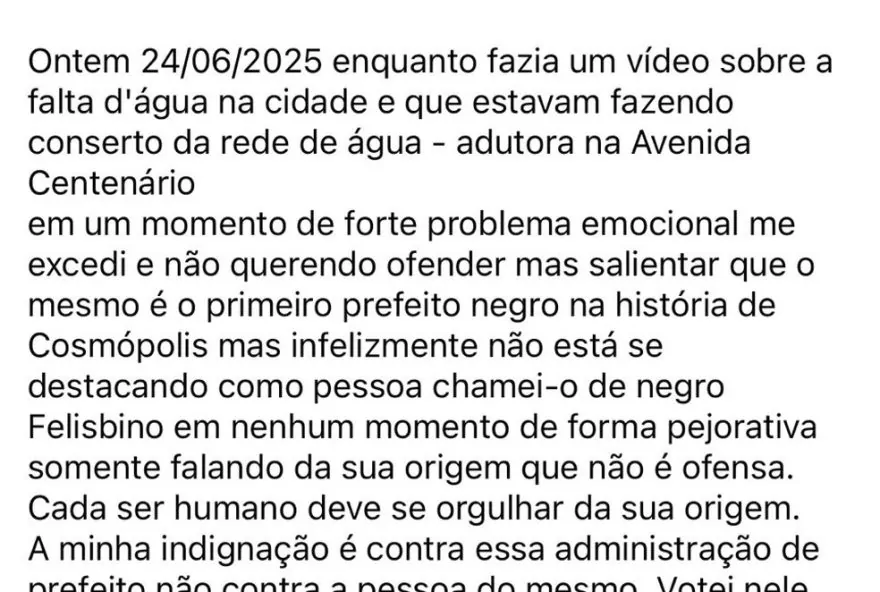 Após a repercussão do conteúdo, Izabel publicou, na tarde desta quarta-feira, um pronunciamento nas redes sociais. Ela disse que se excedeu e não quis ofender, mas sim salientar que ele é o primeiro prefeito negro da história de Cosmópolis.