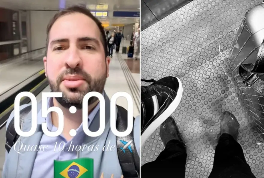 Kayo Amado publicou imagens do retorno ao Brasil na madrugada deste sábado (14). Ele teve o voo para Tel Aviv cancelado durante conexão em Barcelona, na Espanha.