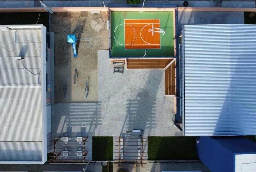 quadra poliesportiva e espaços de convivência, garantindo um ambiente acolhedor