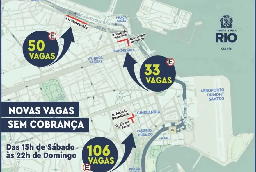As 189 novas vagas de estacionamento serão disponibilizadas sem cobrança nos finais de semana, das 15h de sábado às 22h de domingo. Elas estarão localizadas em vias estratégicas do Centro, como a Rua Primeiro de Março, Rua Visconde de Inhaúma, Avenida Venezuela, Rua Alcindo Guanabara, Rua Álvaro Alvim e Praça Floriano. Com essa medida, a Prefeitura busca incentivar o uso do transporte individual e promover a mobilidade na região central da cidade.