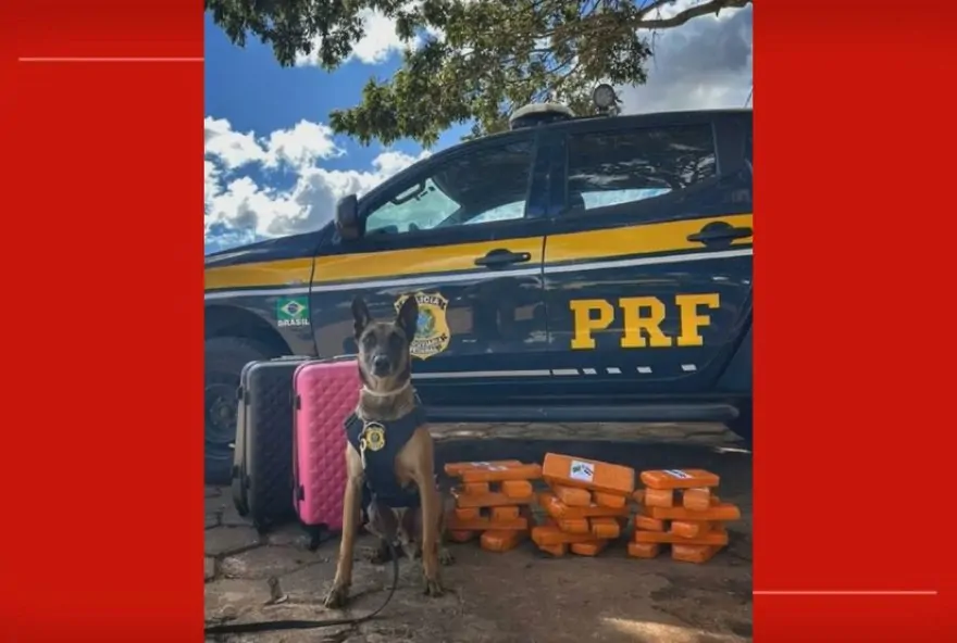 Um cão farejador da Polícia Rodoviária Federal (PRF) encontrou 25kg de maconha em malas de viagem na terça-feira (17), em Planaltina, no Distrito Federal (veja vídeo acima). As malas estavam em um ônibus que fazia uma viagem interestadual, com destino ao Nordeste.