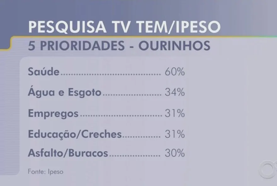 Em Ourinhos, a população respondeu à pesquisa ‘Prioridades’, uma iniciativa da TV TEM junto ao Ipeso e identificou as principais necessidades para melhorias no município, com foco na gestão de 2025 a 2028.