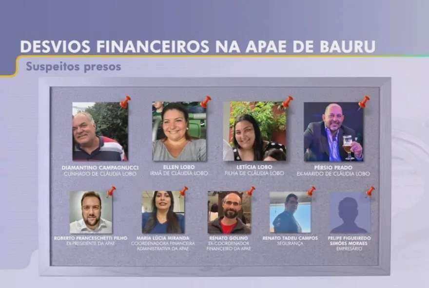 Entre os acusados, estão o ex-presidente da Apae, Roberto Franceschetti Filho, funcionários da instituição e familiares de Cláudia Lobo, ex-secretária executiva da entidade, que está desaparecida desde agosto e, segundo a polícia, foi assassinada por Roberto. Os réus incluem pessoas como Gisele Aparecida de Camargo Tavares, Izabel Cristina dos Santos Albuquerque, Renato Tadeu, Gabriel Gomes da Rocha Rodrigues, Fernando Sheridan Rocha Moreira, Renato Golino, Letícia da Rocha Lobo, Ellen Souza da Rocha Lobo, Diamantino Passos Campaguci Junior, Persio de Jesus Prado Junior, Maria Lucia Miranda e Felipe Guimarães Simões Moraes.