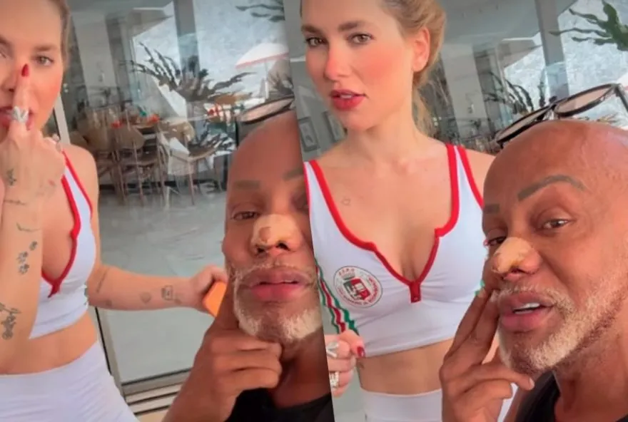 Carlinhos Salgueiro, renomado professor de samba de Virginia, esteve em Goiânia nesta quinta-feira (15) para dar aulas e treinar a influenciadora local. Durante o encontro, apareceu com um curativo no nariz, o que chamou a atenção dos fãs. Após o treino, Carlinhos revelou que a influenciadora presenteou-o com uma rinoplastia, deixando seu nariz com um aspecto mais empinado. Além da rinoplastia, ele também realizou um procedimento na boca e brincou sobre um possível aumento no bumbum e na panturrilha.