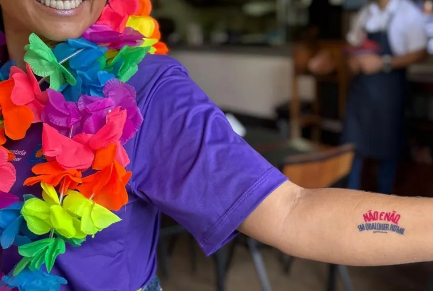 Equipes da Secretaria da Mulher passam por blocos, bares e distribuidoras com cartazes, adesivos e tatuagens temporárias. Material também indica canais de denúncia.