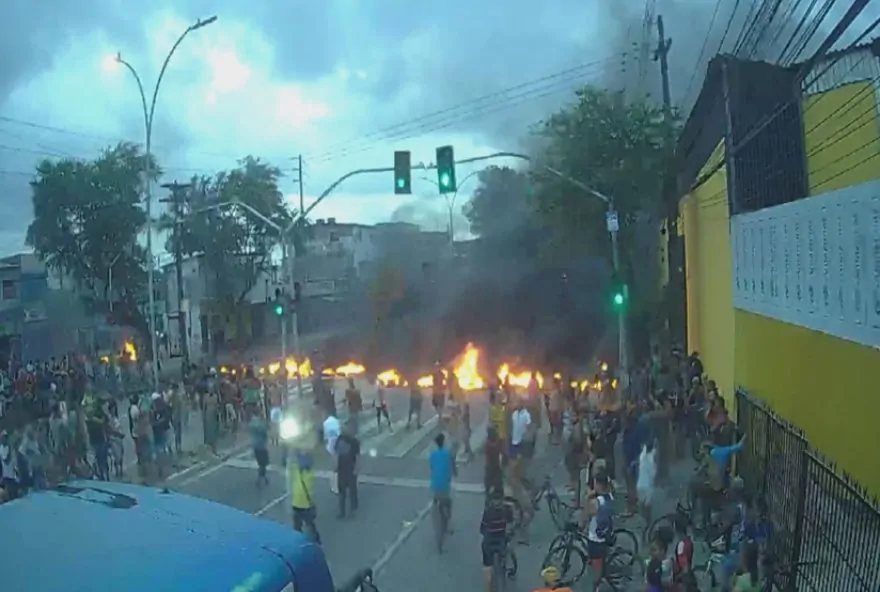 Manifestantes bloqueiam o trânsito na avenida Abdias de Carvalho, no Recife, em um protesto que interrompeu a circulação nos dois sentidos da via. O grupo exige respostas das autoridades em relação à morte de dois jovens que se afogaram ao tentar escapar de um assalto no Açude do Prata. As imagens mostram pneus queimando e bloqueando a avenida Abdias de Carvalho, em uma manifestação que ocorreu no bairro dos Torrões, na Zona Oeste da cidade.