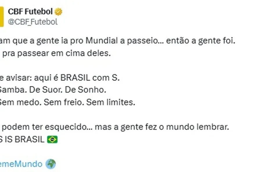A CBF publicou nas redes sociais: “Diziam que a gente ia pro Mundial a passeio… então a gente foi. Mas pra passear em cima deles”.