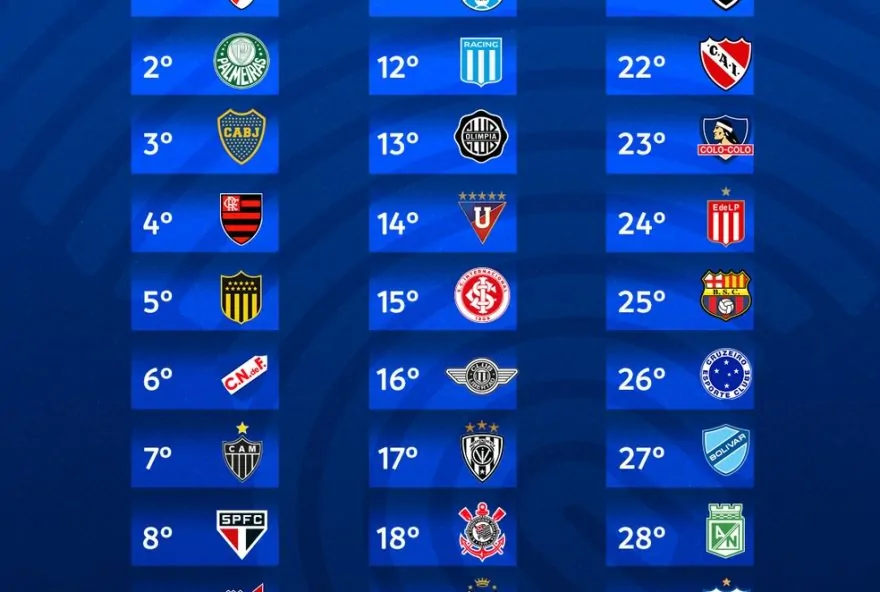 O ranking da Conmebol atualizado trouxe boas notícias para os clubes brasileiros, com Palmeiras e Flamengo figurando no Top-4 ao lado de River Plate e Boca Juniors. O clube paulista está na segunda colocação, enquanto os cariocas ocupam a quarta posição. Além deles, outros times do Brasil também aparecem bem colocados, como Atlético-MG (7º), São Paulo (8º), Athletico-PR (9º), Fluminense (10º), Grêmio (11º), Internacional (15º), Corinthians (18º), Santos (19º), Botafogo (21º) e Cruzeiro (26º), todos no Top-30.