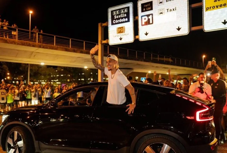 Com o corpo para fora do carro, Antony saúda torcedores do Betis no aeroporto. Chegada do brasileiro, agora contratado em definitivo, anima a torcida do time espanhol. Antony é recebido pela torcida do Betis no aeroporto. Ansiosa ao longo de toda a janela de transferências pela volta do atacante Antony, a torcida do Betis não quis esperar uma apresentação oficial para reencontrar o brasileiro. Na noite desta segunda-feira, poucas horas após o clube anunciar a contratação do camisa 7, centenas de torcedores foram ao Aeroporto de San Pablo, em Sevilha, para receber o ídolo.