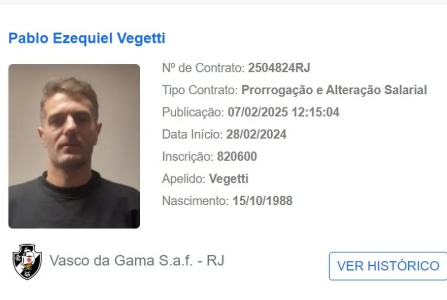 O Vasco [https://globoesporte.globo.com/futebol/times/vasco/] registrou no início da tarde desta sexta-feira o novo contrato com o atacante Pablo Vegetti no BID da CBF. As partes chegaram a um acordo para um aumento salarial e a prorrogação do vínculo até o fim de 2026.