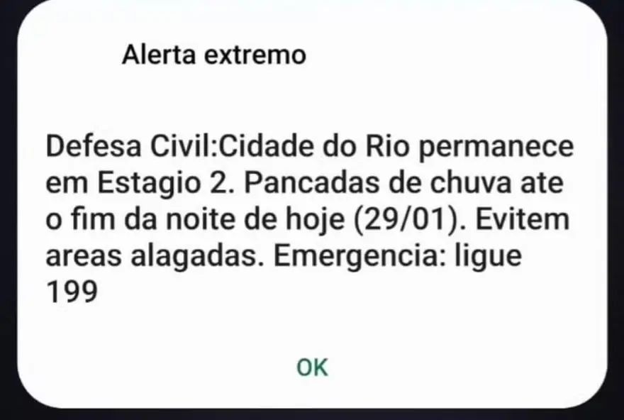 O Rio de Janeiro emitiu seu primeiro “alerta extremo” para chuvas nesta quarta-feira, chamando a atenção dos cariocas com um aviso sonoro que tocou em celulares no início da noite. A Defesa Civil anunciou que a cidade entrou no estágio 2 de alerta devido às fortes pancadas de chuva com raios que atingiram a Região Metropolitana. Esse é o segundo de cinco níveis de gravidade que indicam risco de ocorrências de alto impacto na cidade. As zonas Norte e Oeste do município foram as mais afetadas, com núcleos de chuva atuando lentamente e se deslocando em direção à Baixada Fluminense e à Ilha do Governador.
