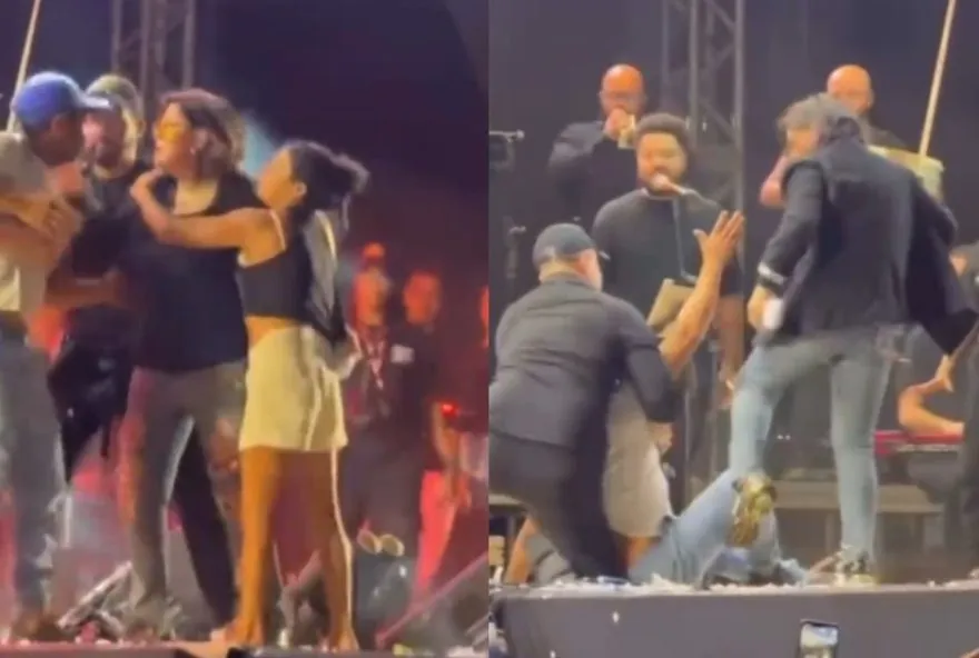 palco. No mesmo momento, um homem também subiu. Enquanto era contido por um