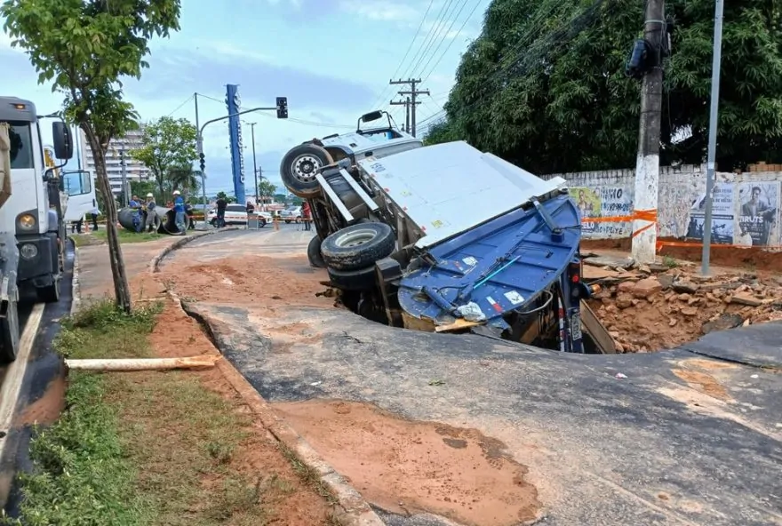 Uma cratera se abriu e engoliu um caminhão de coleta de lixo na Zona Oeste de Manaus, na madrugada desta quarta-feira (11). Não houve feridos. O veículo foi retirado com o apoio de equipes da Prefeitura por volta das 9h30.