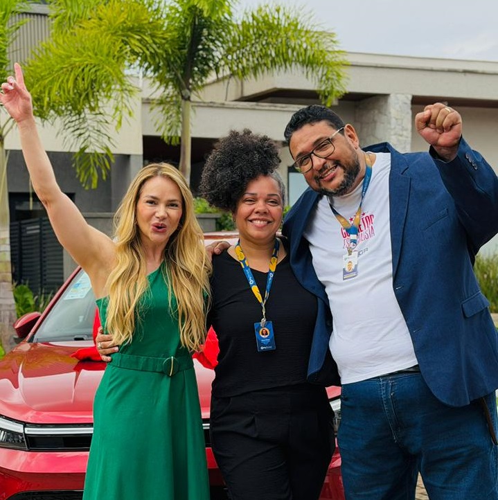 SORTE GRANDE – A corretora de imóveis Thaís Bispo (ao centro) foi só alegria durante a última festa de premiação do ano da FGR Incorporações, realizada em Goiânia. E não era para menos: ela foi uma das ganhadoras dos cinco carros 0 km sorteados no evento. Na foto, Thaís recebe os cumprimentos de Camila Alcântara, diretora comercial e de marketing da FGR, e de Márcio Cupertino, gerente de incorporação da My Broker