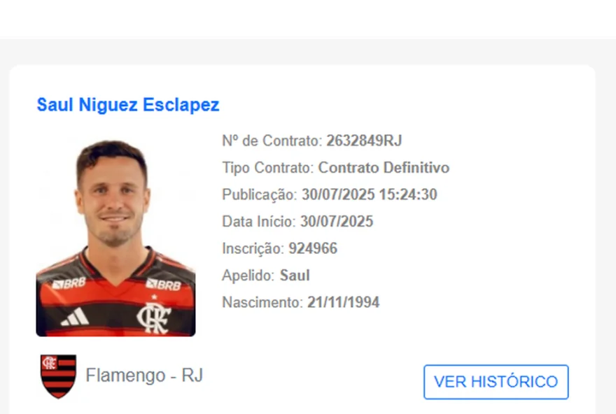 Saúl e Samuel Lino são regularizados no BID e já podem estrear pelo Flamengo. Saúl teve o nome publicado no BID na tarde desta quarta-feira e também o atacante Samuel Lino. Ambos os jogadores já podem entrar em campo representando o clube carioca. No entanto, Saúl ainda precisa passar por um recondicionamento físico antes de ser relacionado para as partidas, pois não joga desde o fim da temporada europeia.