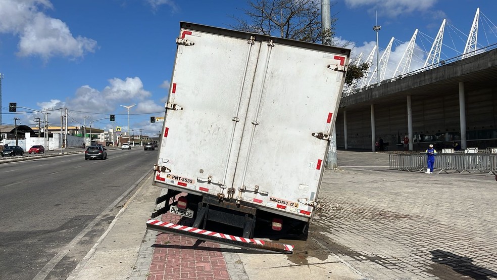 TV Verdes Mares flagra ao vivo caminhão afundando pneu na calçada da Arena Castelão; vídeo mostra incidente sem feridos e destaca necessidade de reparos.
