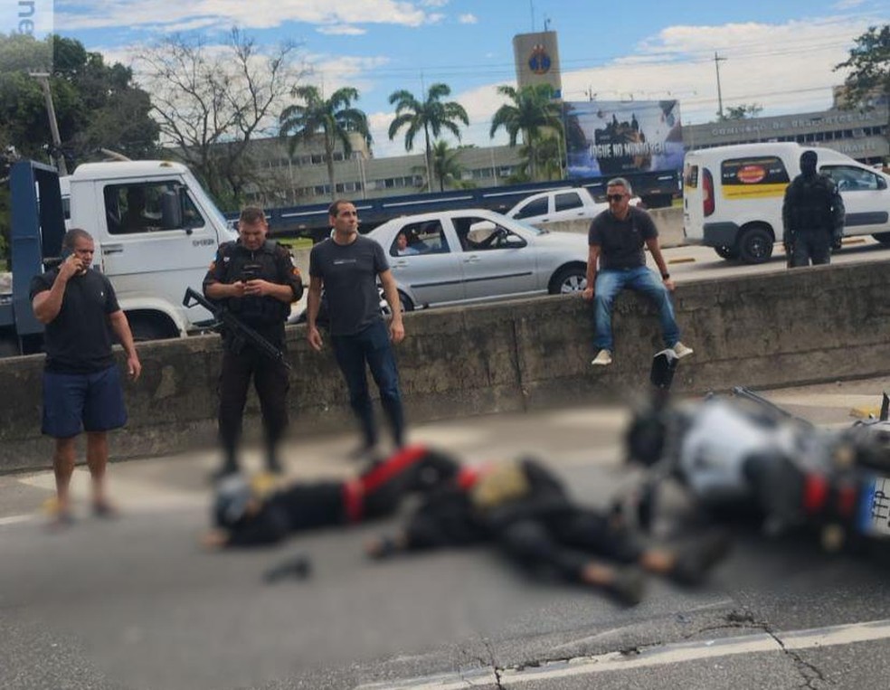 Suspeitos são mortos em tentativa de assalto a PM de folga na Avenida Brasil, na Penha. Ocorrência causa lentidão no trânsito. Dois homens morreram.