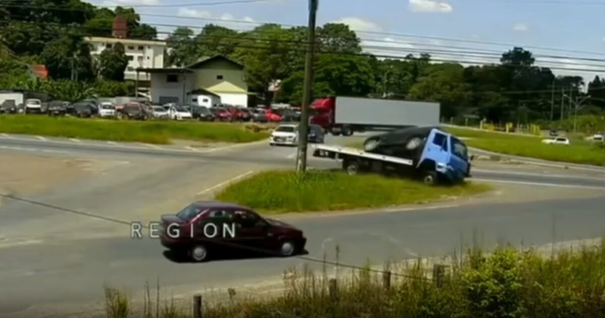 Carro caiu de guincho na BR-470 em Blumenau após colisão. Vídeo circula nas redes sociais. Não houve feridos no acidente.