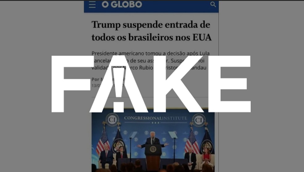 Propagação de fake news: imagem falsa do jornal O DE sugere que Trump suspendeu entrada de brasileiros nos EUA, mas informação é totalmente fabricada. Confira os desdobramentos! Evite disseminar notícias enganosas.