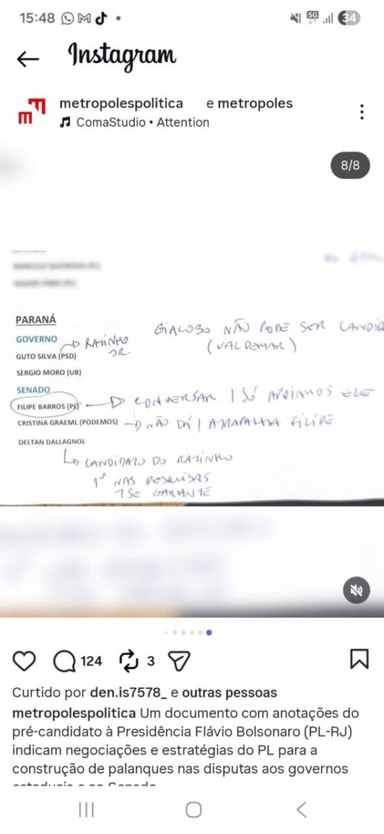Anotações indicam Guto Silva como candidato de Ratinho Junior no Paraná em material de Flavio Bolsonaro.