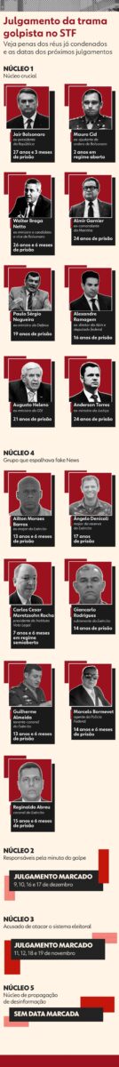 A Primeira Turma do Supremo Tribunal Federal (STF) vai julgar entre 7 e 14 de novembro, no plenário virtual, os recursos do ex-presidente Jair Bolsonaro e outros seis réus do chamado “núcleo crucial” da trama golpista. A informação foi confirmada nesta segunda-feira, 27, pelo ministro Alexandre de Moraes, por meio do sistema do STF. Moraes […]