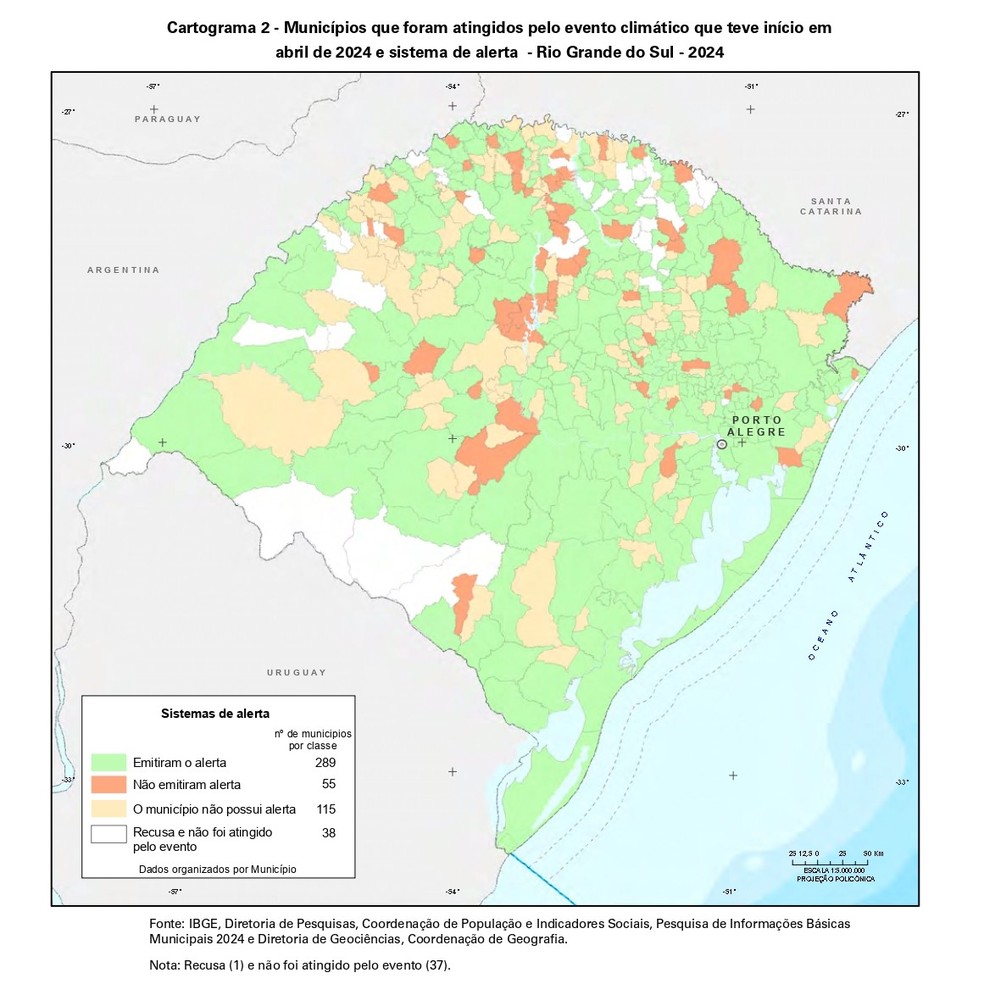 Enchente de 2024 no RS: Mais de 30% dos municípios atingidos não emitiram alertas para a população, aponta IBGE. Levantamento detalha impactos da enchente.