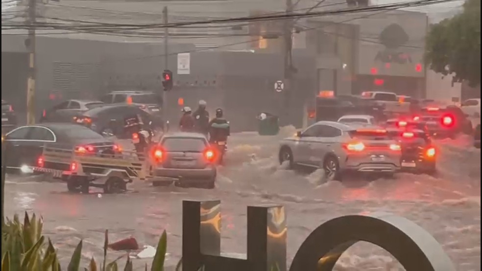 Prefeito de Goiânia fecha rua 87 durante chuvas fortes, motoristas serão bloqueados. Alagamento durante temporal gera preocupação na região.