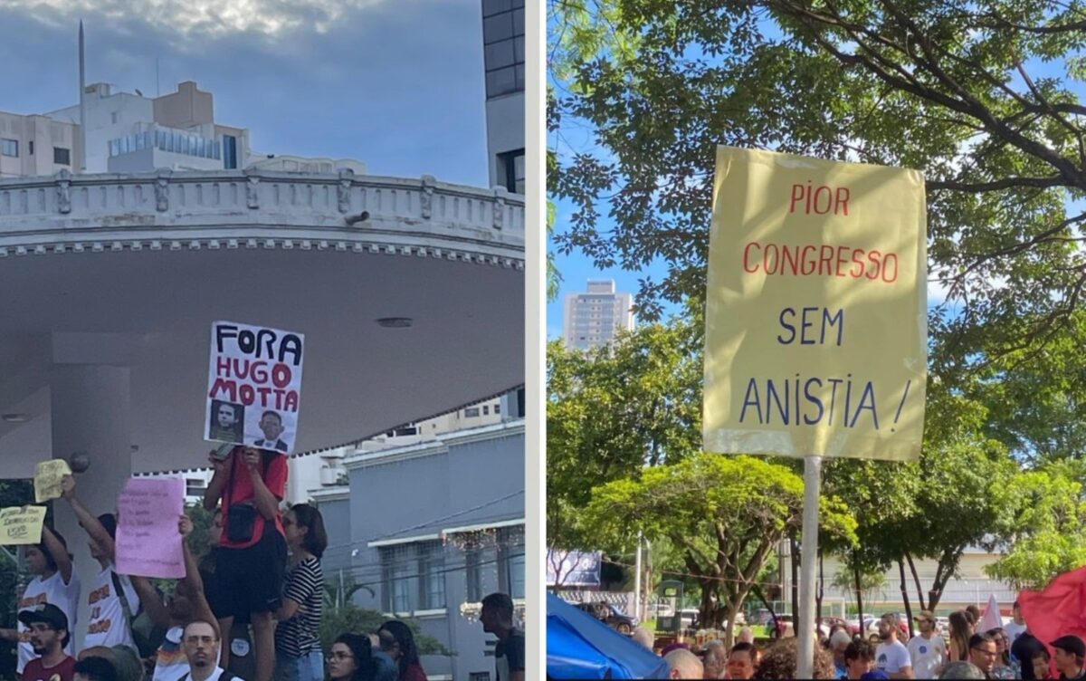 Populares se manifestam contra a anistia em ato convocado pelas redes sociais na Praça Universitária de Goiânia. Mobilização reuniu participantes durante a tarde.